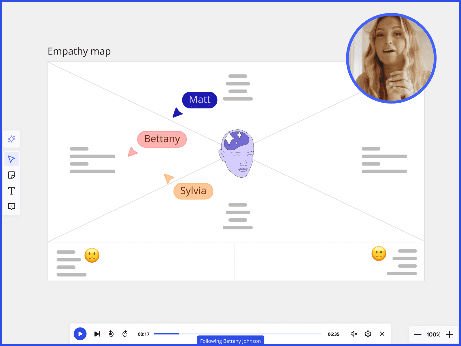 With advanced collaboration features that make real-time and async teamwork a breeze, move from unstructured discovery work to organized output, all in Miro.