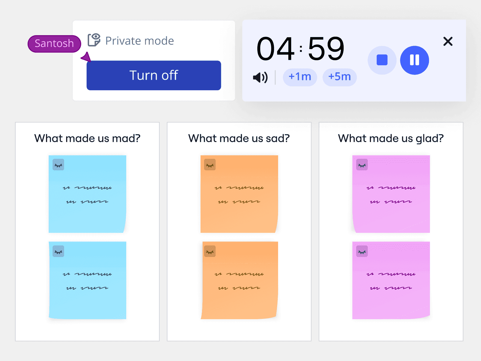 With anonymous retrospectives, you can gather authentic feedback from every teammate, thanks to Private Mode and Timer.