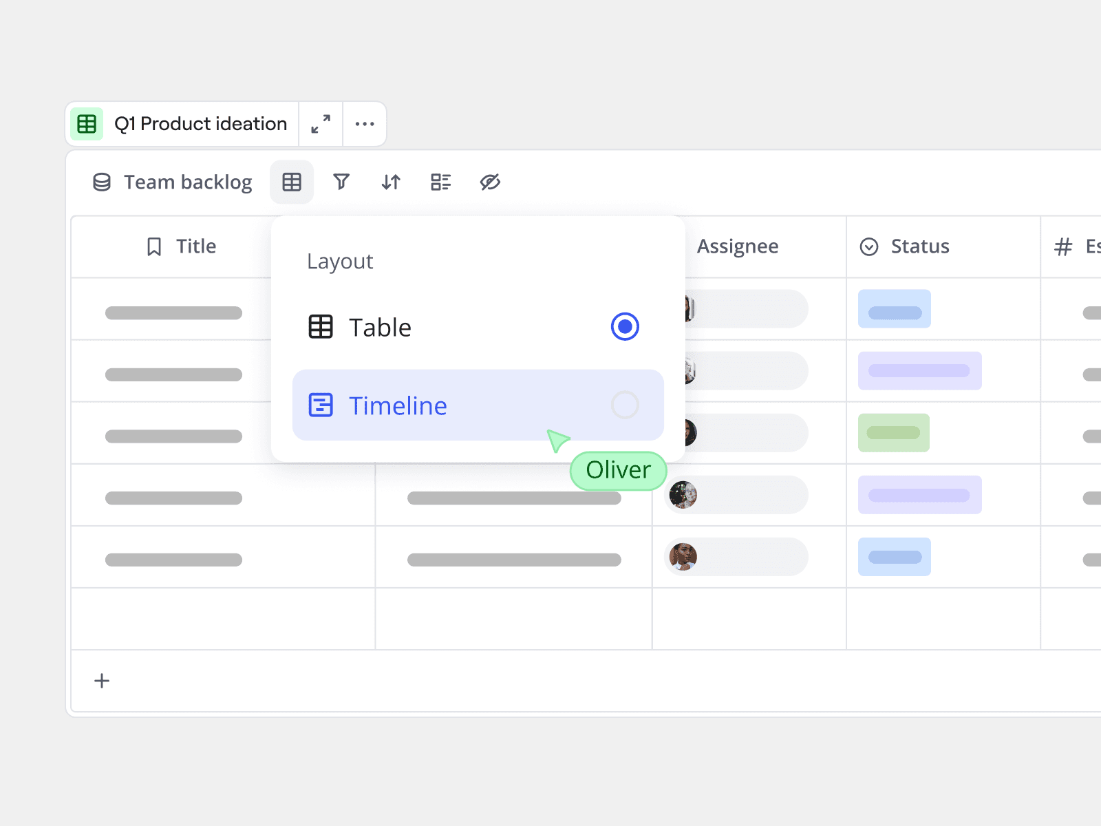 Manage your idea backlog and make it easier to structure and prioritize roadmap candidates. Easily switch between data table and timeline view.