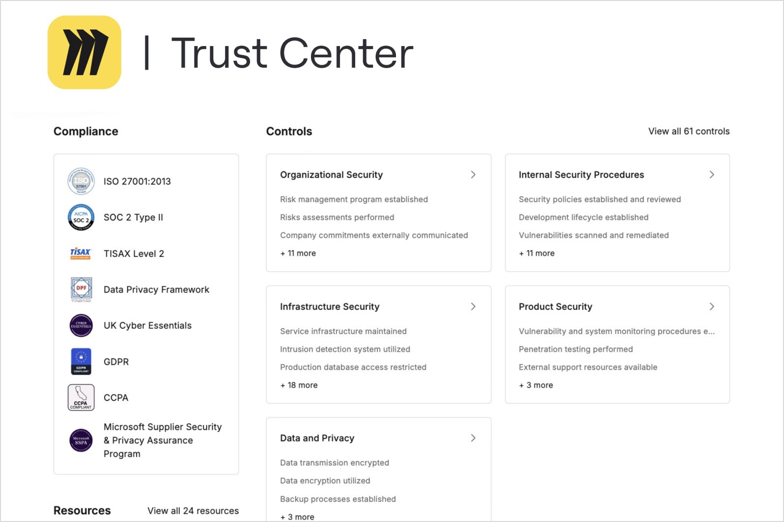 We follow industry best practices and regulatory requirements, including ISO/IEC 27001, NIST, SOC2 Type II, SOC3, and TISAX.